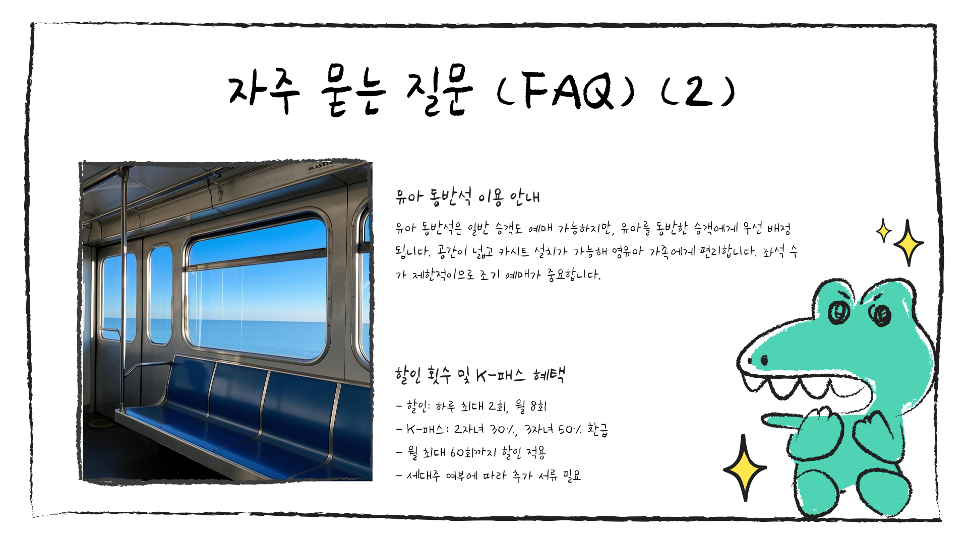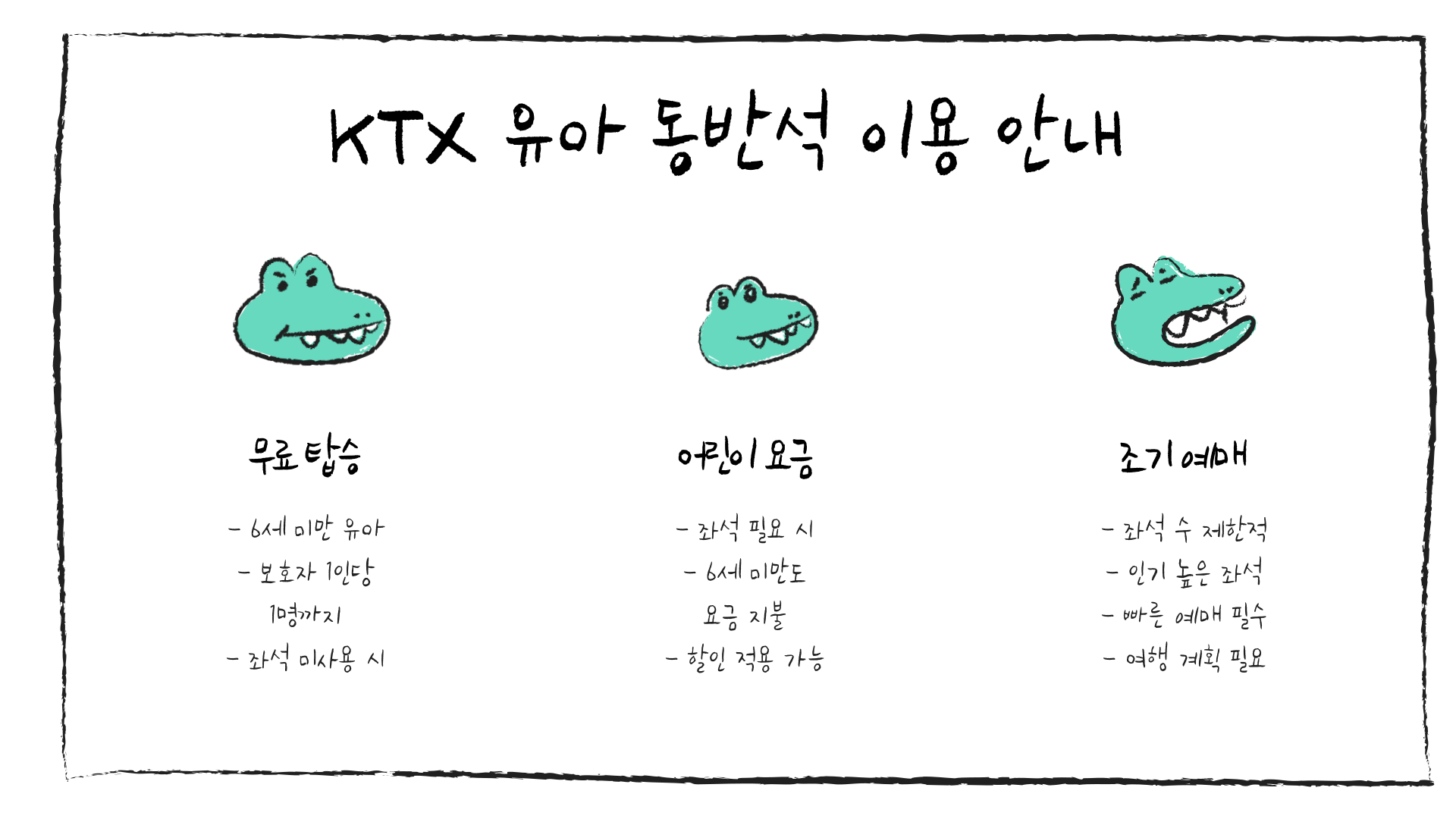하지만 좌석을 원할 경우 어린이 요금을 지불해야 하며, 유아 동반석은 좌석 수가 적기 때문에 미리 예매하는 것이 중요해요.