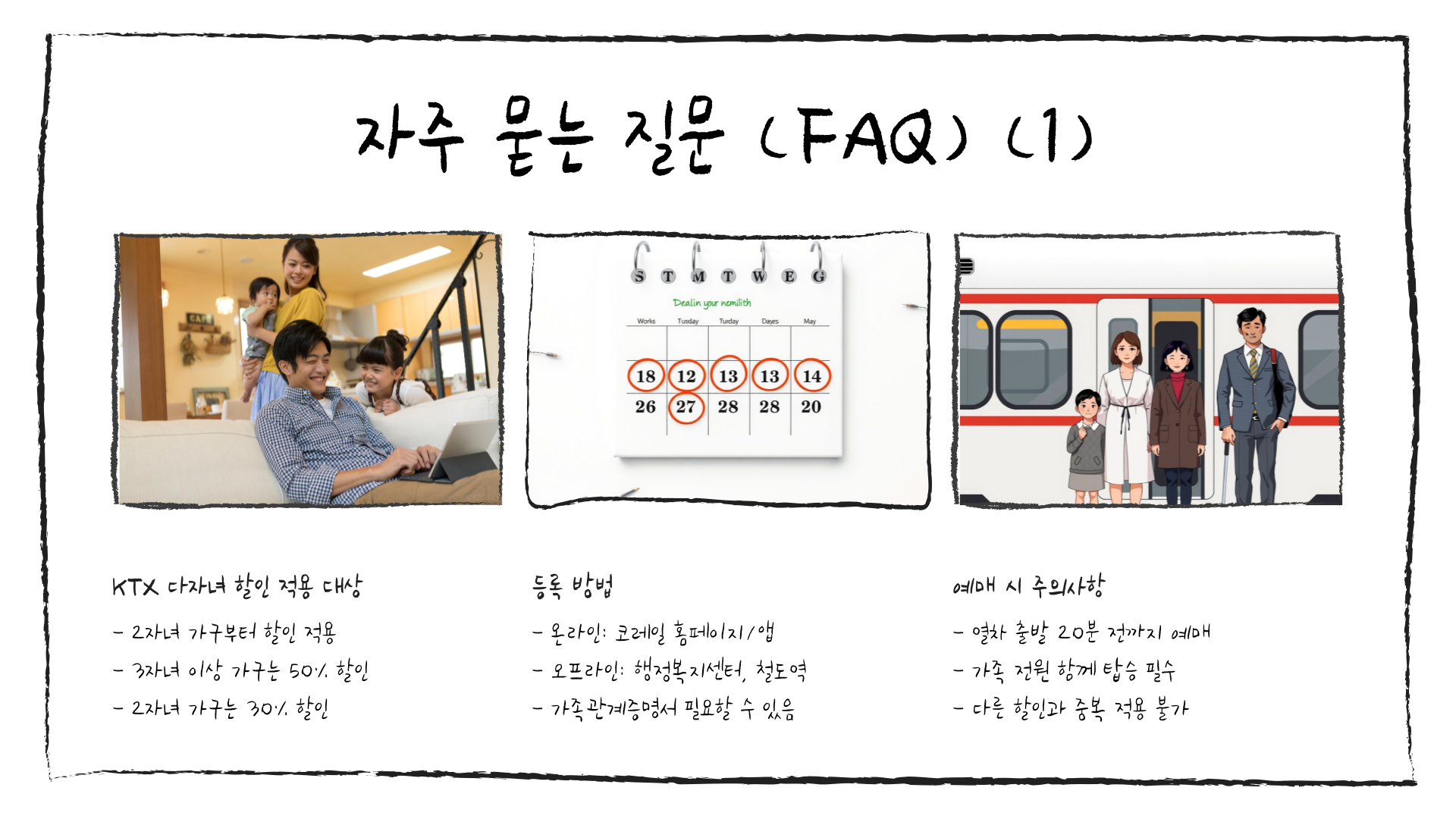 가족 전원이 함께 탑승해야 하며, 가족정보가 등록되어 있어야 하고, 열차 출발 20분 전까지 예매해야 할인 적용이 가능해요.