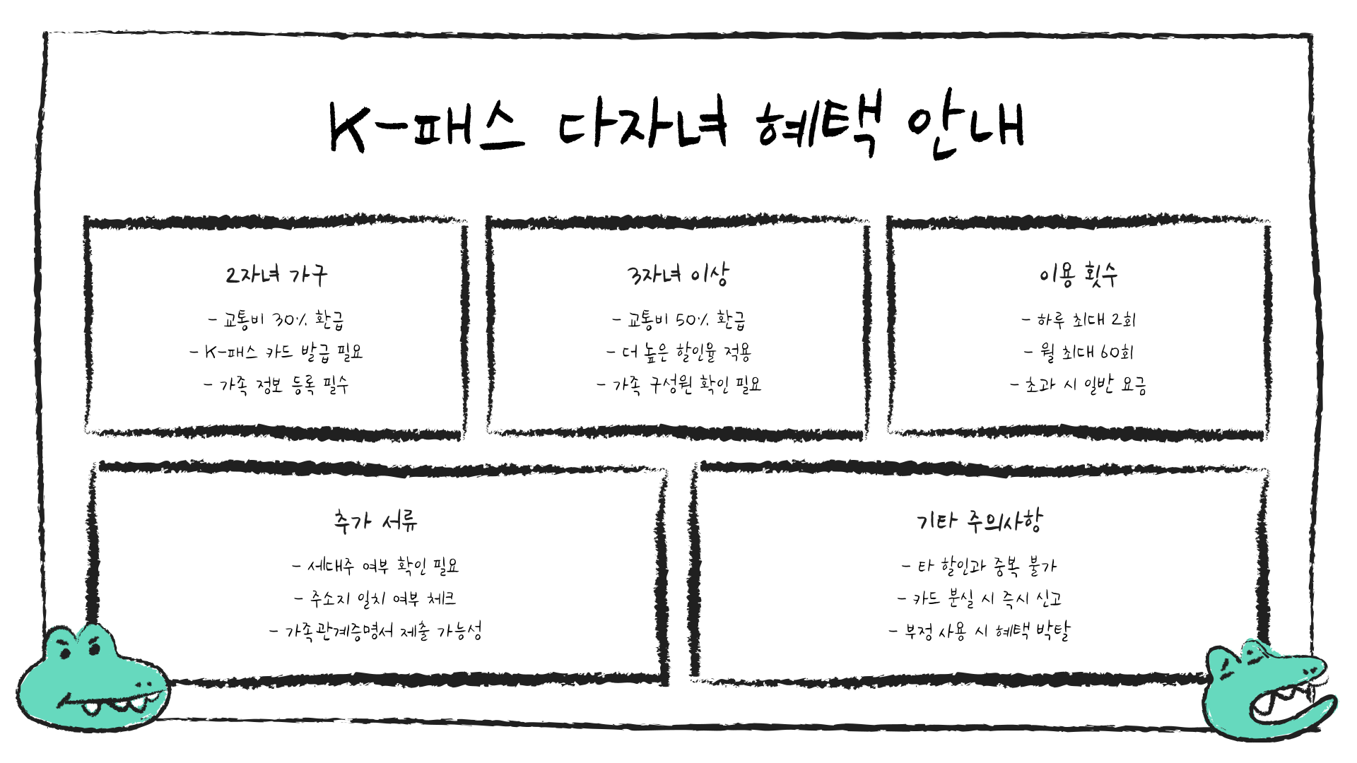 K-패스 카드도 요즘 완전 핫하죠. 특히 다자녀 가구라면 혜택이 두 배! 아래는 K-패스를 통해 얻을 수 있는 다자녀 혜택 정리입니다.
