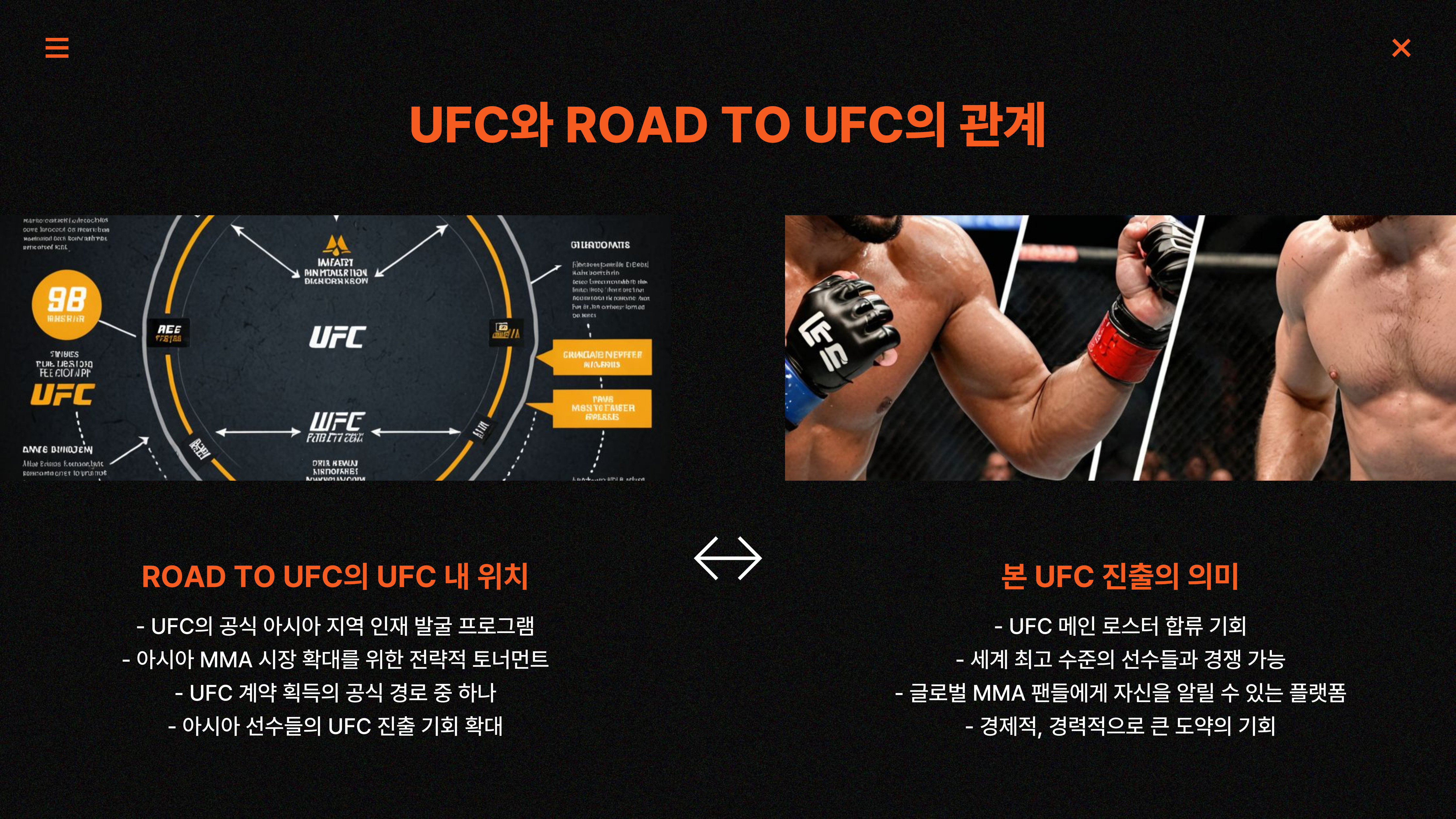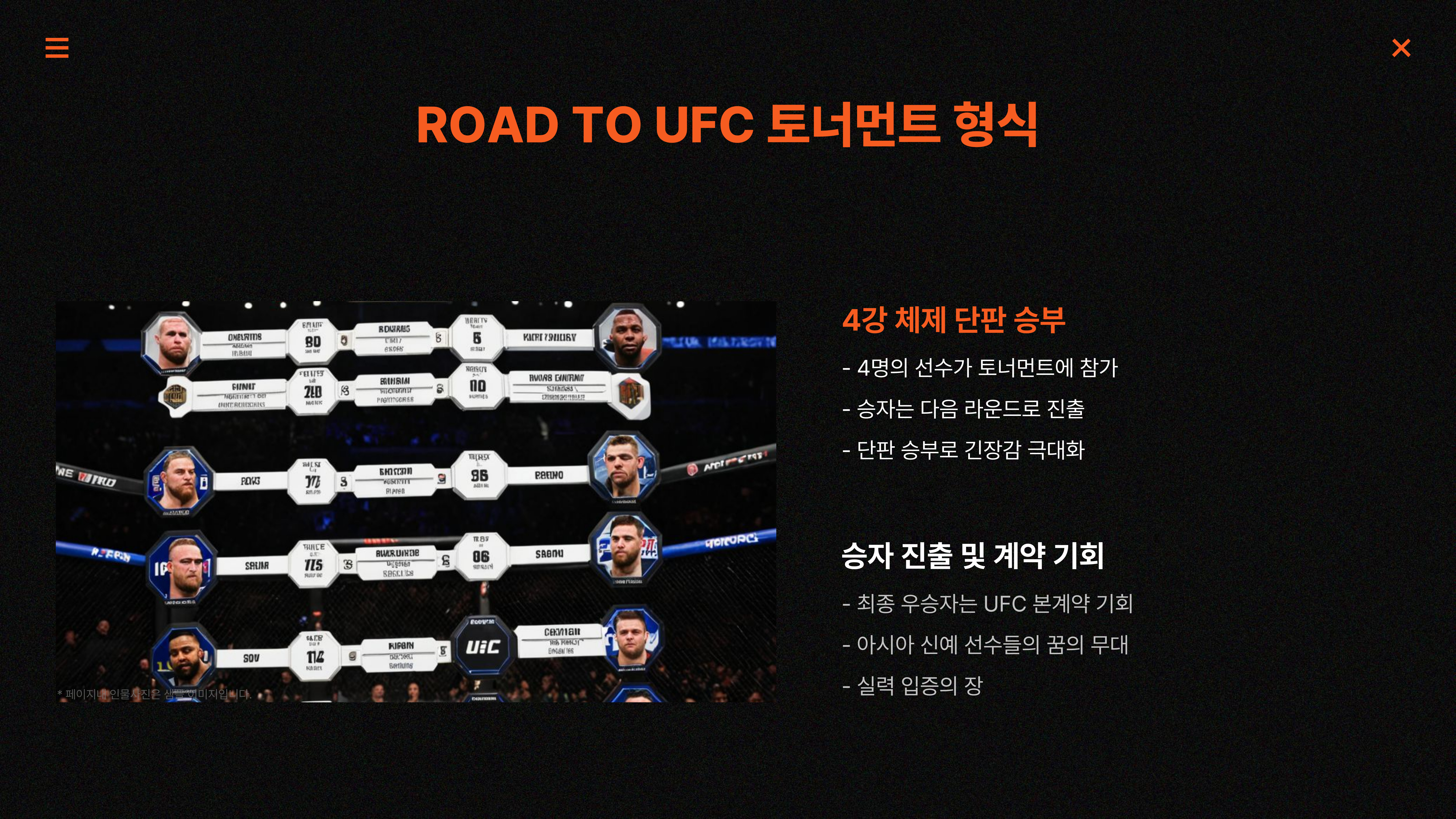 ROAD TO UFC는 아시아권 신예 파이터들이 UFC 무대 진출을 목표로 토너먼트 형식으로 겨루는 대회입니다.