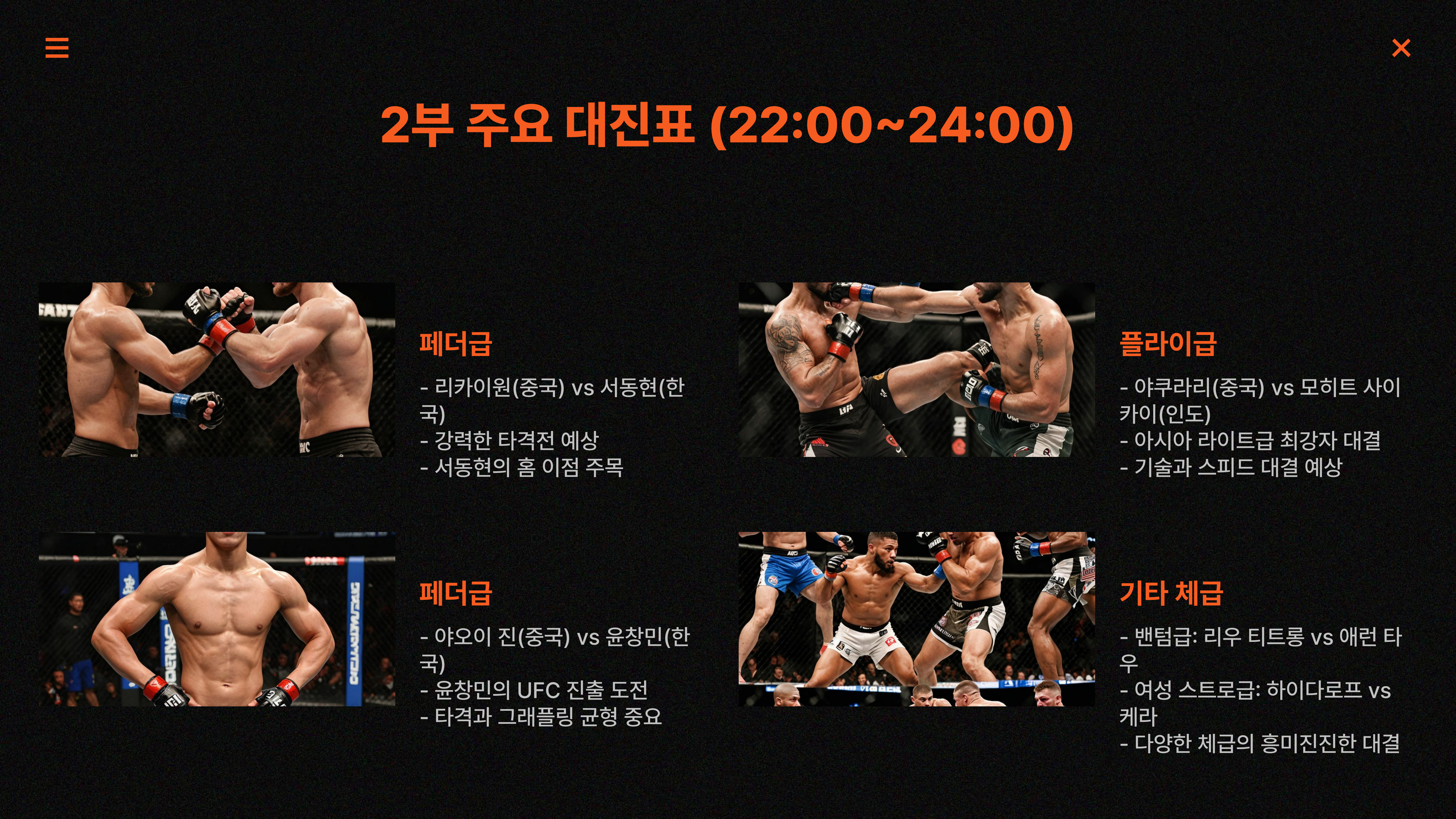 1부와 2부로 나뉘어 진행되며, 각 부마다 다양한 체급과 국가의 파이터들이 출전하여 뜨거운 승부를 펼칩니다.